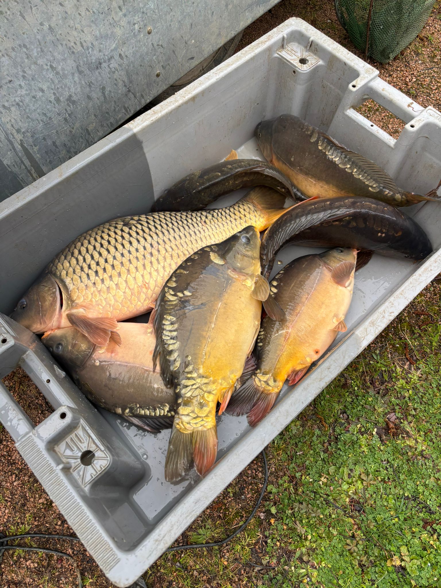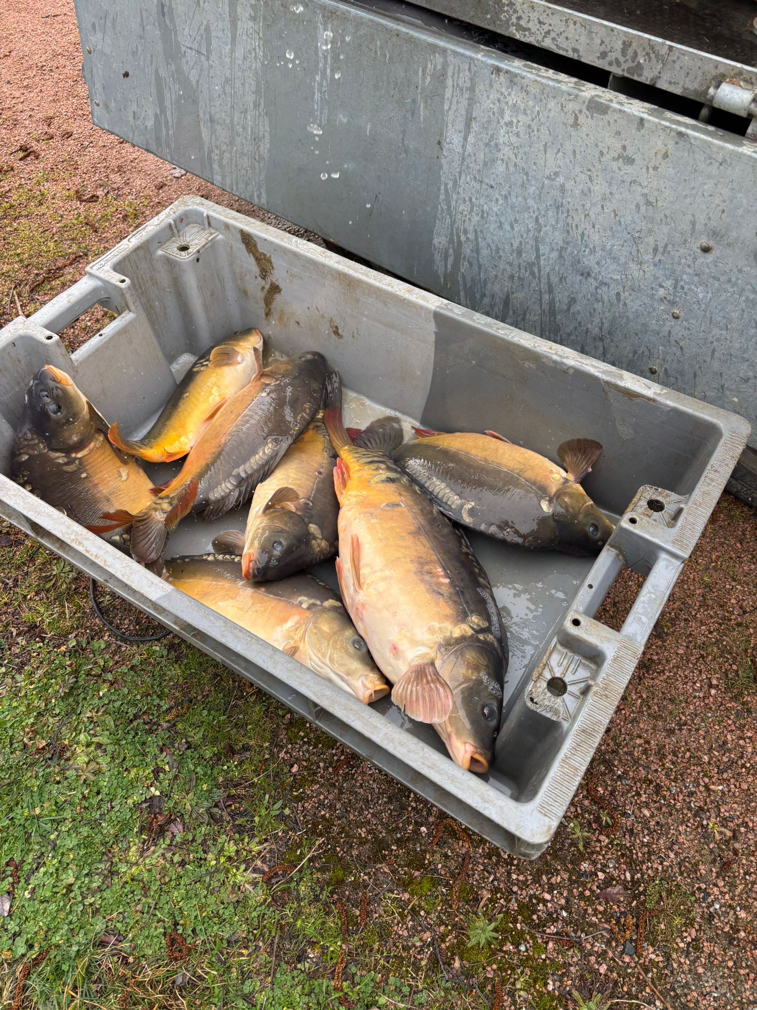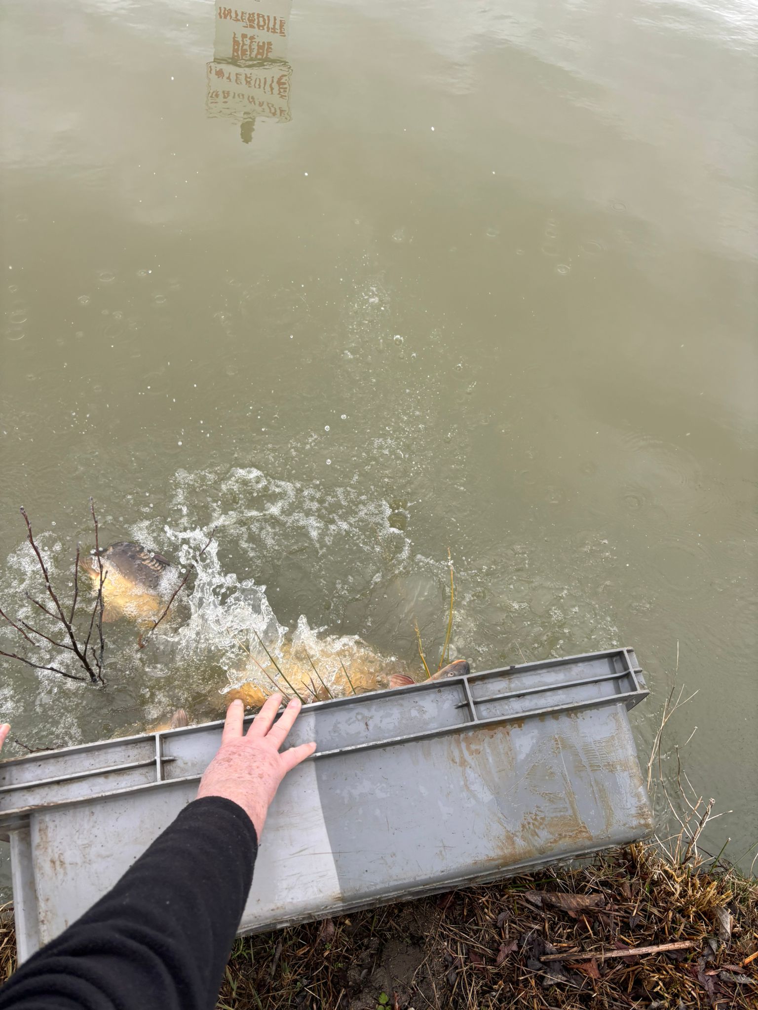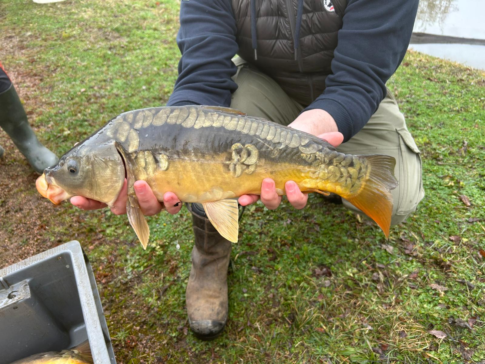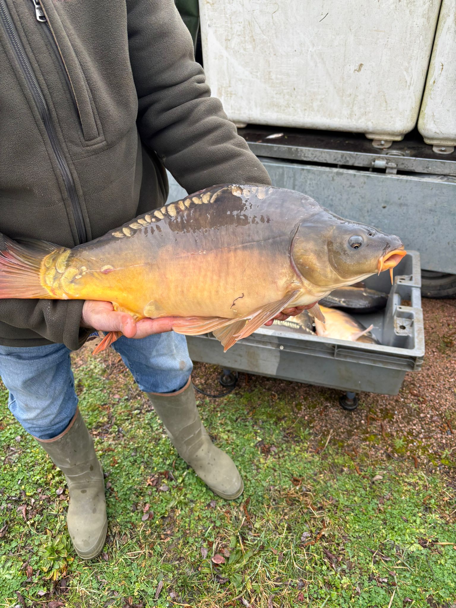 250kg de carpes (mitoirs et communes) sont venus alimenter le grand étang (et quelques petits gabarits dans le petit étang) !